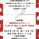ご予約状況! 2025年11月6日 カテゴリー: お知らせ 店主のくるぽんです。11月6日の木曜日です。 【特製ばらちらしご予約状況】特製ばらちらしは例年締め切り後にたくさんのお電話を頂きますが、個数は50個限定です。残り6個となっております。締め切り日に関係なく限定個数に達し次 […]