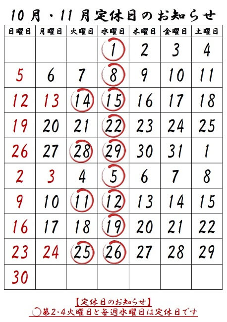 10月定休日のお知らせ!